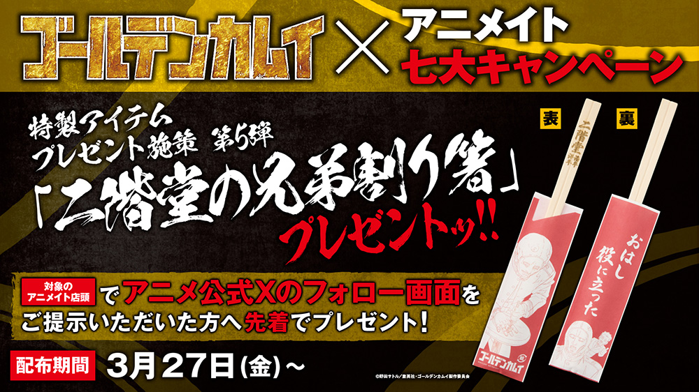 3月27日(金)より、対象店舗の店頭でTVアニメ『ゴールデンカムイ』公式X【@kamuy_anime】のフォロー画面をご提示いただいた方へ、先着で「二階堂の兄弟割り箸」をプレゼント!