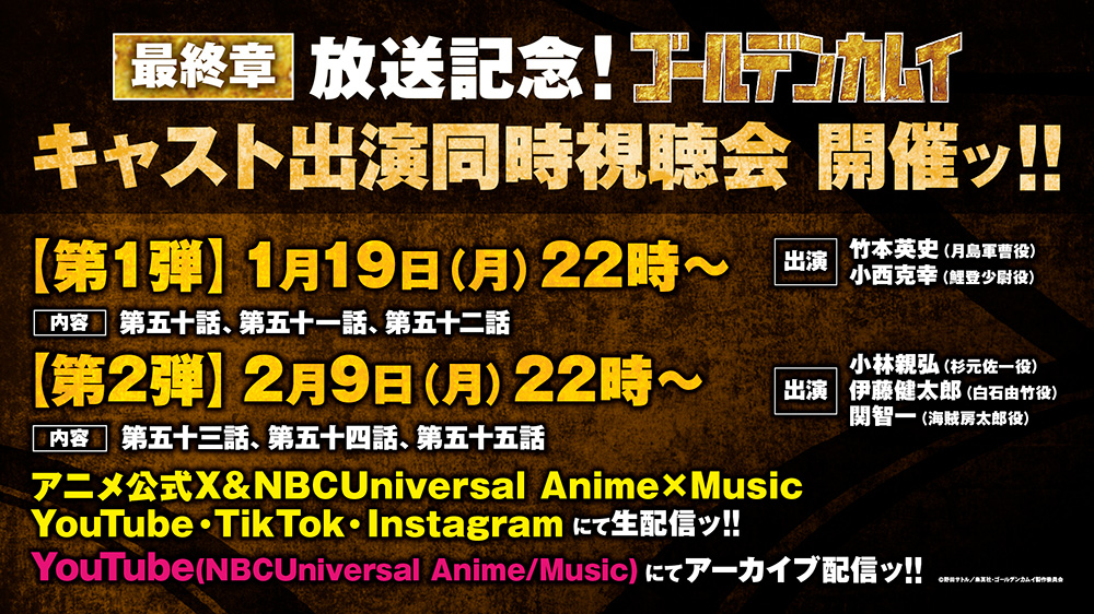 - アニメ公式X、NBCUniversal Anime×MusicのYouTube・TikTok・Instagramから、TVアニメ『ゴールデンカムイ』キャスト出演同時視聴会のページにアクセスしてください。