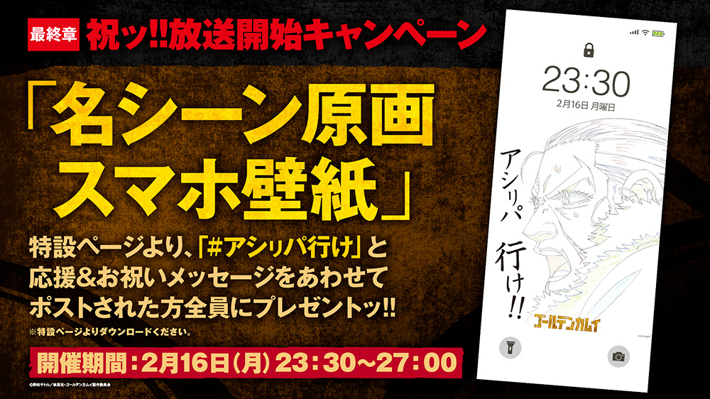 このページから、指定の名言ハッシュタグと、応援&お祝いメッセージをあわせてポストされた方全員に、お礼の「名シーン原画スマホ壁紙」(各話1種)をプレゼントッ!!