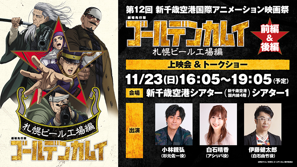2025年11月21日(金)~25日(火)にて開催される「第12回 新千歳空港国際アニメーション映画祭」にて、劇場先行版『ゴールデンカムイ』札幌ビール工場編【前編&後編】上映会&トークショーが開催決定ッ!!